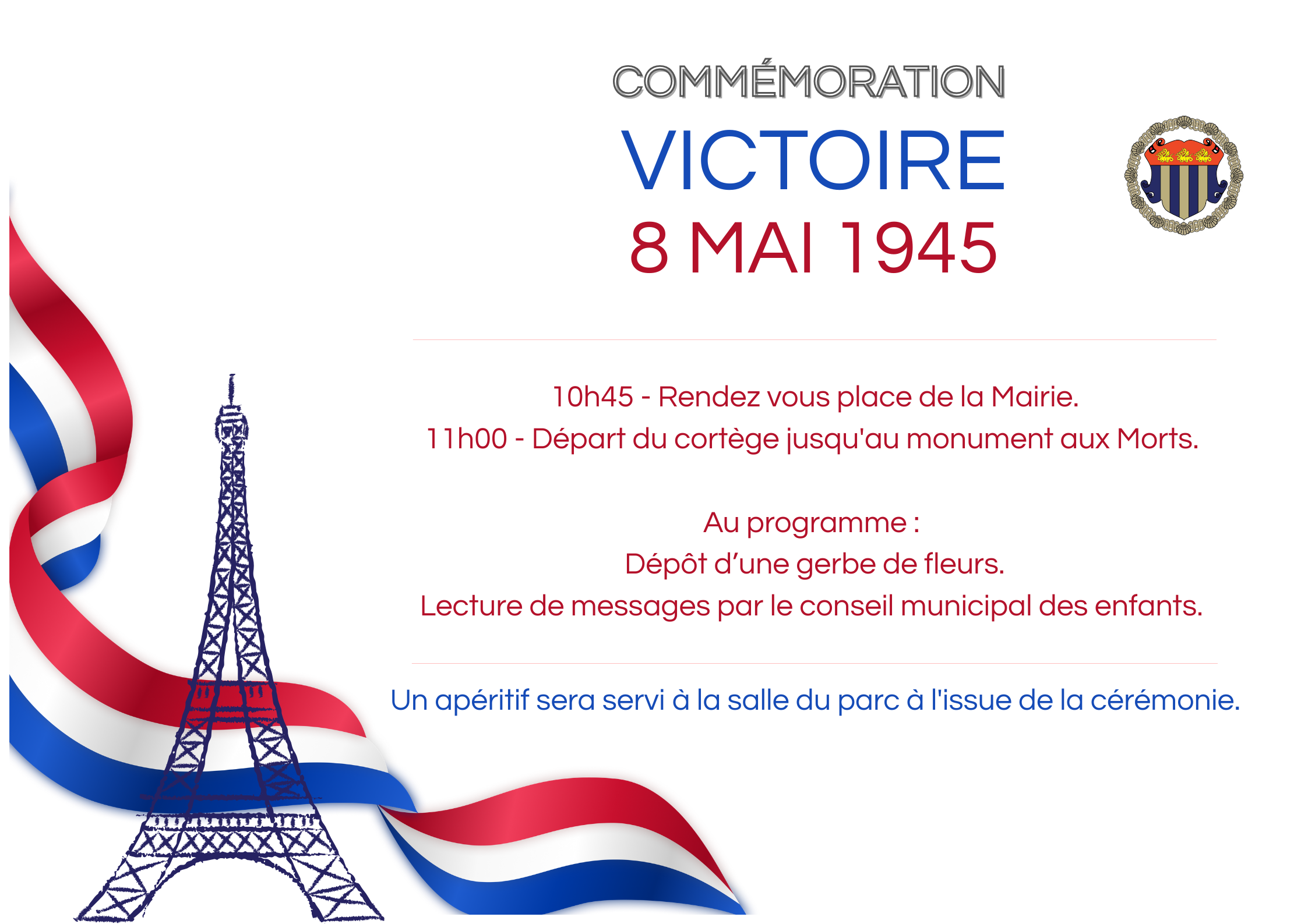 Rendez-vous pour la commémoration du 8 mai Place de la Mairie à 10H45.